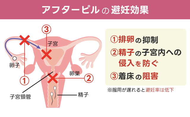 アフターピルは排卵を抑制する作用や、受精卵の着床を阻害など複数の作用を持ち、妊娠に必要な「排卵」「受精」「着床」この3つを阻害することで避妊効果をもたらします。