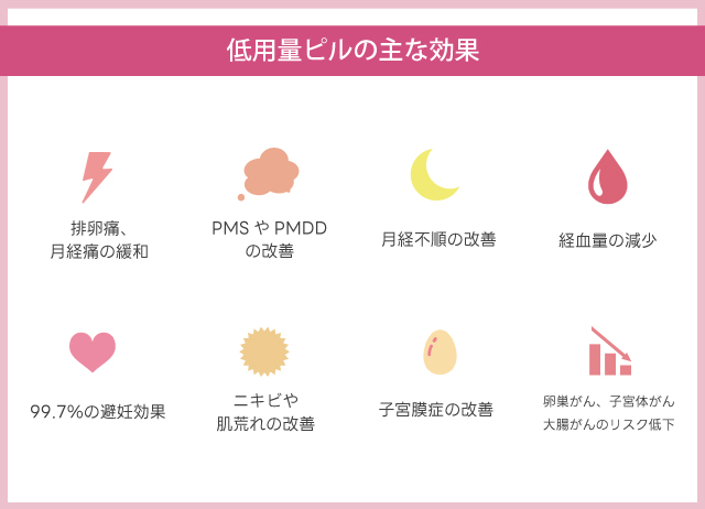 主に避妊を目的とする際に使用されますが、低用量ピルのホルモンバランスを安定させる作用により、避妊以外にも生理痛や肌荒れ、ニキビ改善といった様々な効果が期待できます。