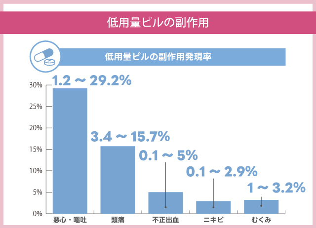 しかし、これらの副作用は低用量ピルの飲み始め頃に起こりやすいと言われているため、服用を続けて2~3ヵ月頃になると自然に緩和されていきます。