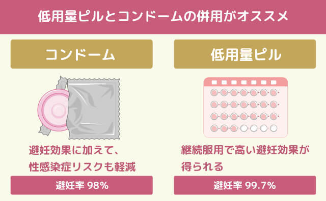望まない妊娠や性感染症のリスクを減らすためにも、低用量ピルとコンドームの併用がおすすめです。