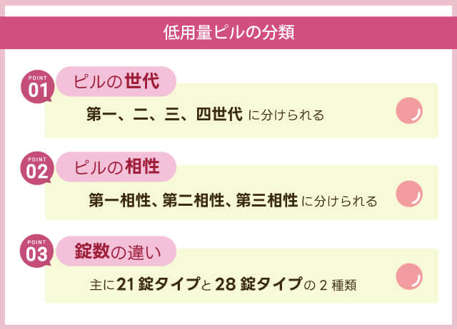 低用量ピルは様々な種類があり、主に「世代」「相性」「錠数」によって種類が分けられています。