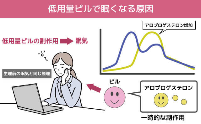 低用量ピルにはこの黄体ホルモンが含まれているため、その影響で眠くなると考えられます。