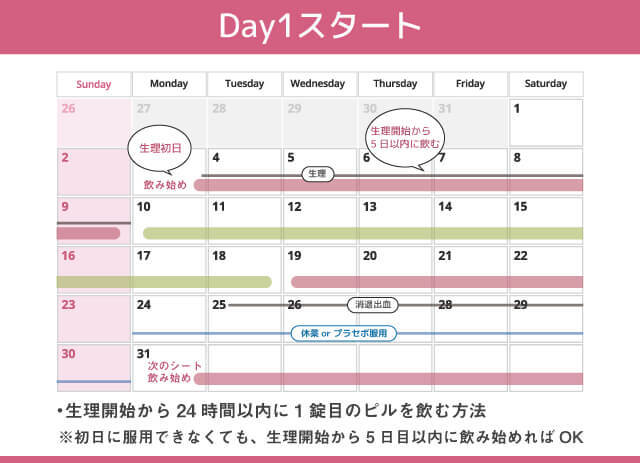 Day1スタートは、生理開始日から低用量ピルを飲み始める方法で、生理が始まってから24時間以内または、生理開始5日以内に1錠目を服用し始めます。