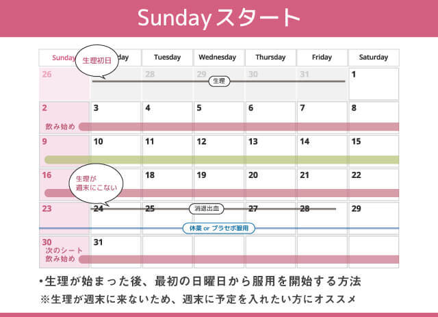 Sundayスタートは、月~土曜日の間に生理が始まった場合、次の日曜日から服用を開始します。