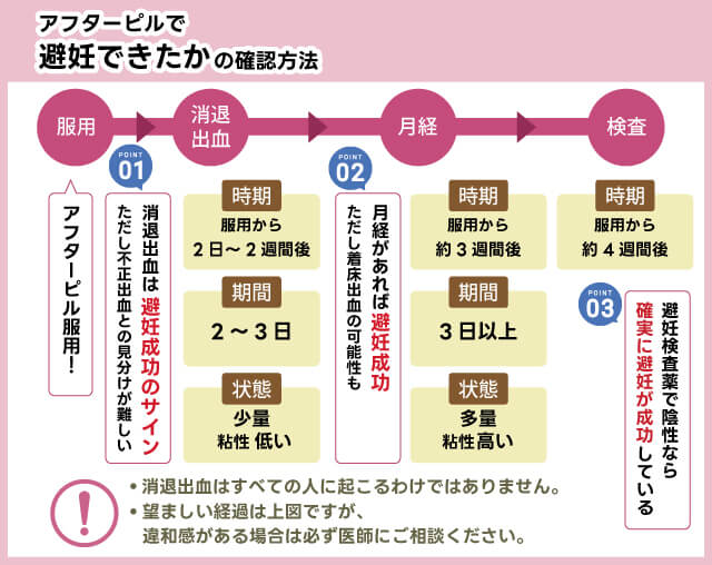 アフターピルを服用した後は、2日〜3週間後までに避妊成功のサインである『消退出血』が起こります。