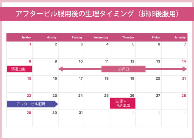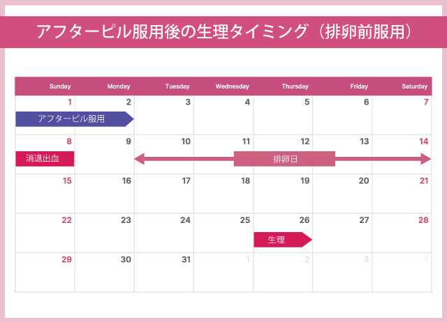 排卵前に避妊失敗してアフターピルを服用した場合は、排卵を抑制する作用が働き、服用から2日〜2週間後を目安に消退出血(生理に似た出血)が起こるとされています。