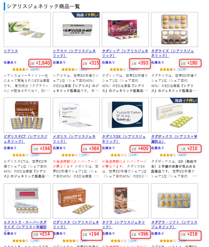 なので、シアリスジェネリックを比較する際は「1錠あたりいくらで購入できるのか?」をチェックしておきましょう。