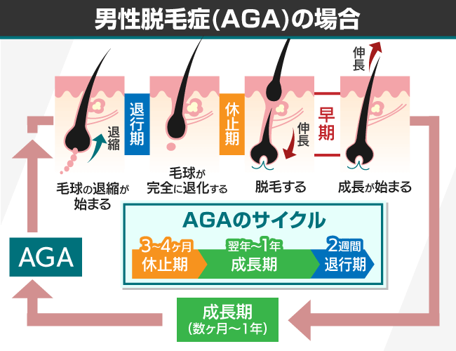 AGAはAndrogeneticAlopeciaの略で、別名、男性ホルモン型脱毛症(男性型脱毛症)と呼ばれています。