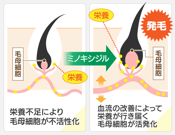 この活動が止まる期間のことを休止期と呼びますが、この状態を髪の毛が成長する成長期へと変えてくれるのがミノキシジルです。