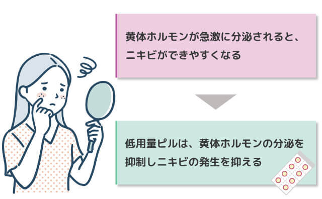 低用量ピルを服用すると、体内に女性ホルモンが追加されることで一時的にニキビが増えることがあります。